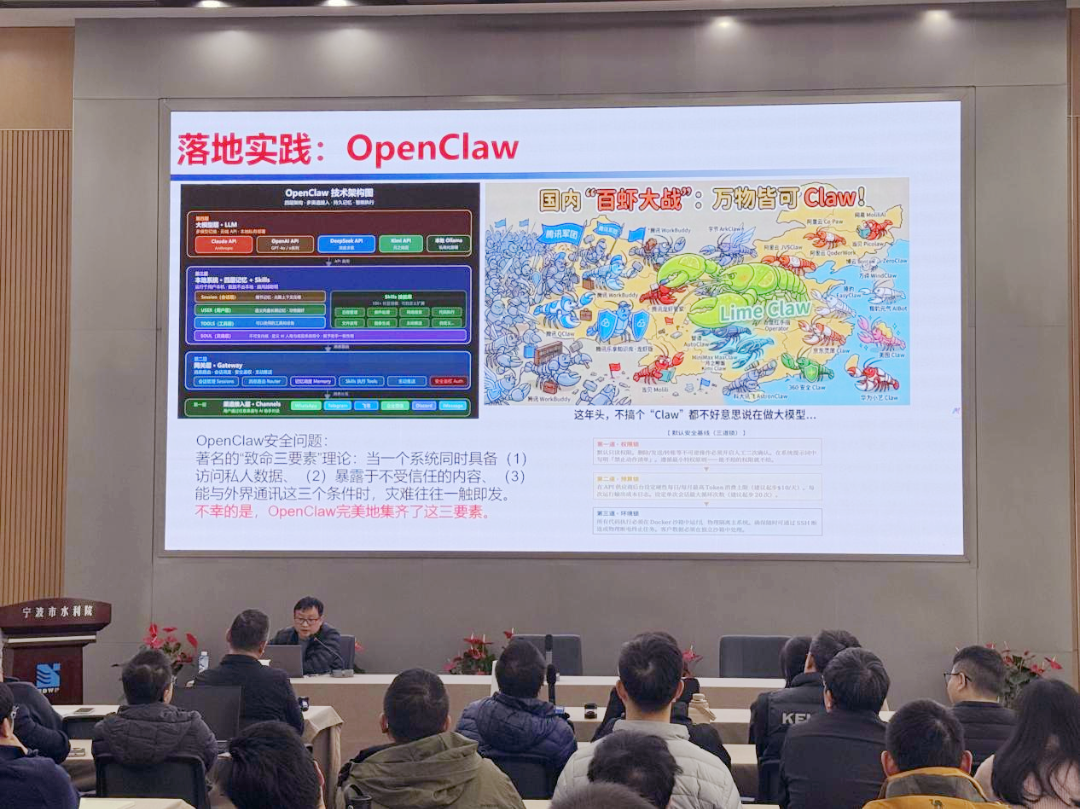 本次專題培訓(xùn)圍繞AI智能體的概念展開,簡要分析其與大模型的區(qū)別,系統(tǒng)闡述了智能體的發(fā)展歷程、構(gòu)成要素及落地實施路徑,并現(xiàn)場演示了“數(shù)智水院智能體”及當(dāng)下流行的OpenClaw等應(yīng)用實踐案例。演示環(huán)節(jié)生動直觀,引發(fā)參訓(xùn)干部的濃厚興趣。大家紛紛表示深受啟發(fā),對AI賦能勘察設(shè)計工作有了更清晰的認知和更強的信心。